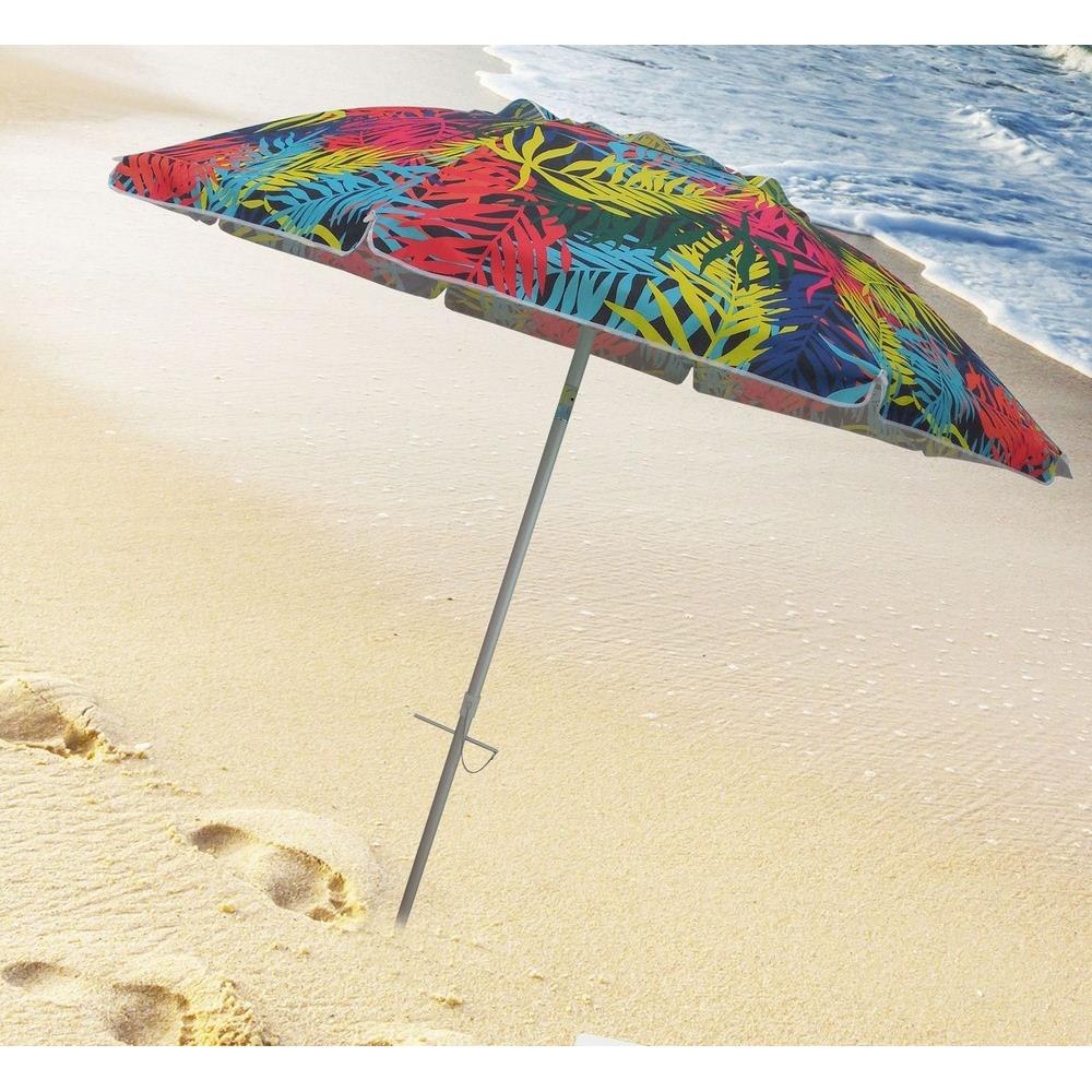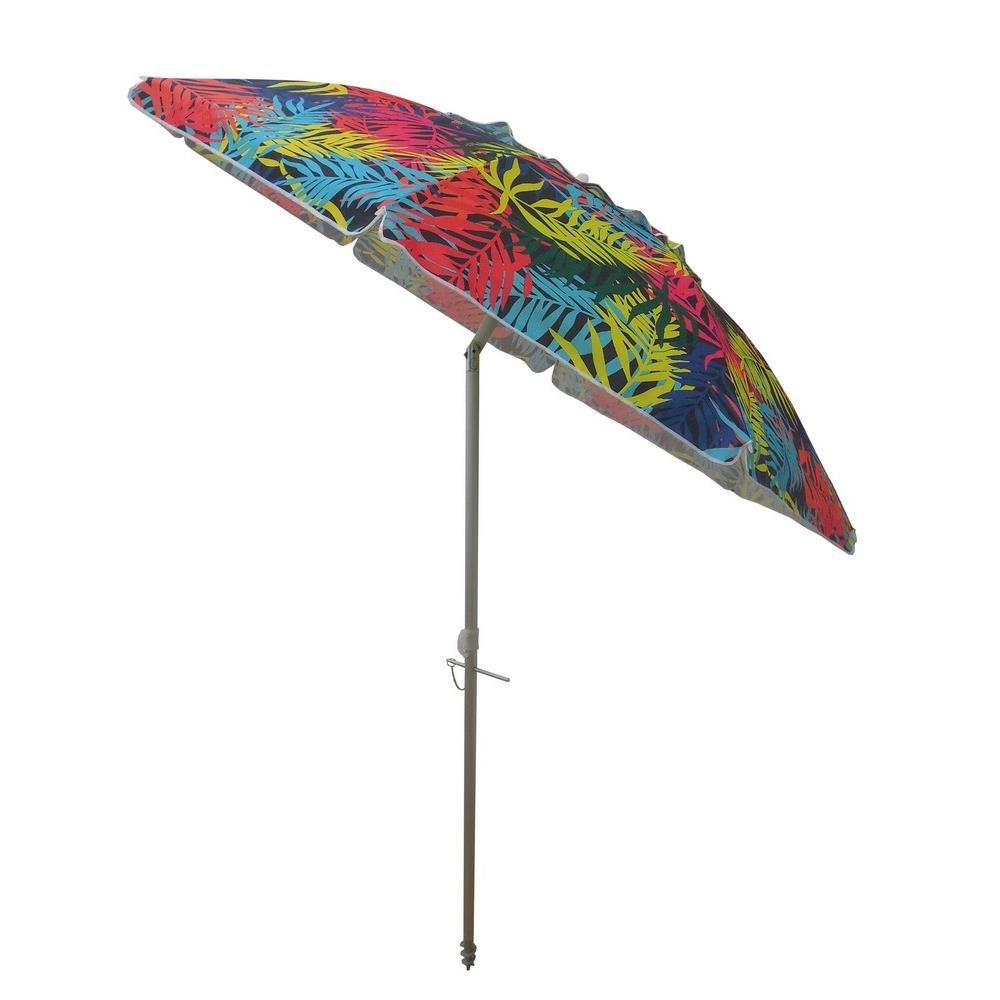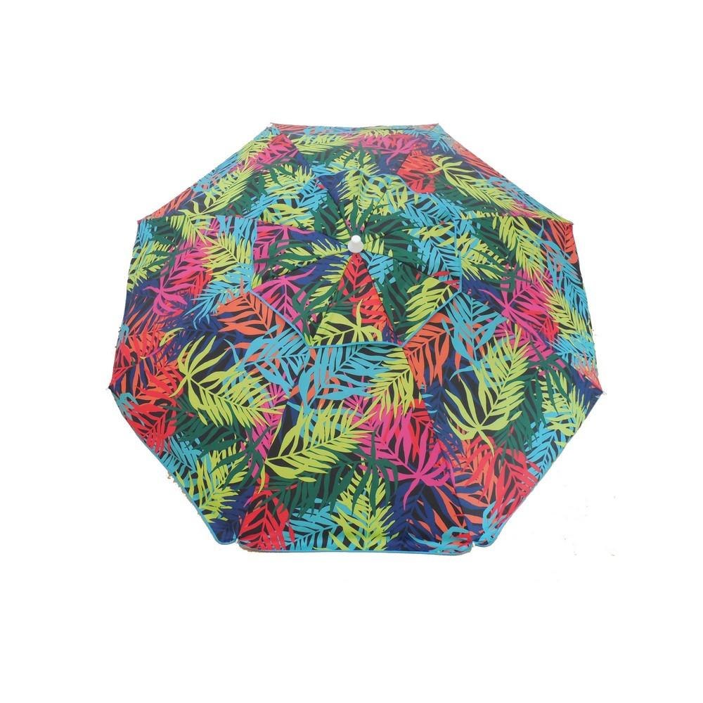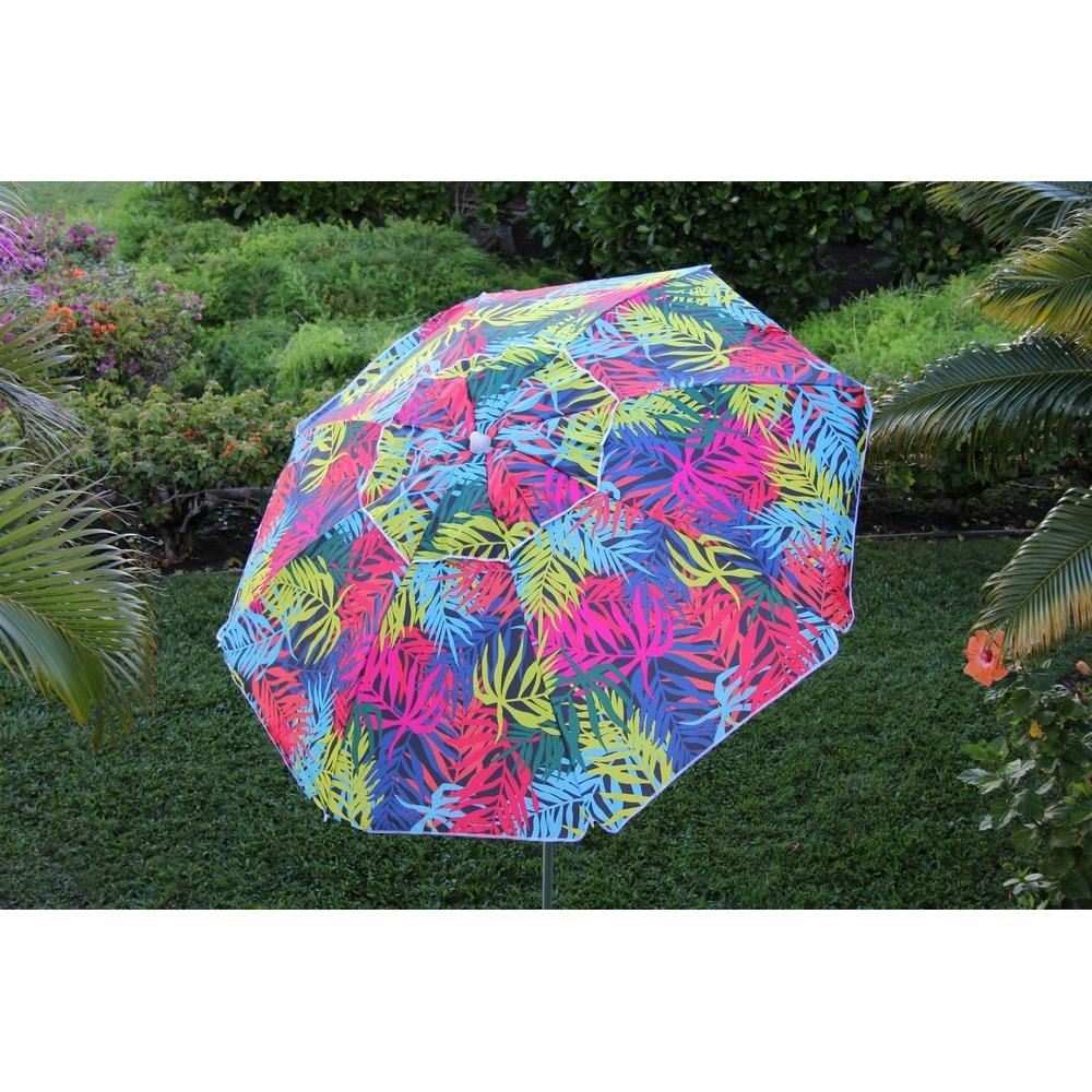Head To The Beach With This 7' Beach Umbrella! With A Fun And Colorful Palm Pattern This Umbrella Instantly Makes Any Outdoor Activity Feel Like A Party, With Its Fun And Colorful Design. Also, Works Great Next To The Pool- Just Stick The Pole In The Grass! The 7 Foot Diameter Umbrella Will Keep You And Your Friends Or Family Shaded From The Suns Harmful Uv Rays As Well As Any Uncooperative Weather. This Umbrella Offers A Sturdy 8 Fiberglass Ribs And A Sturdy Aluminum Pole. An Easy Push Up, Standard Style Mechanism Allows Anyone To Put Up Or Take Down This Lightweight Umbrella. The Umbrella Also Has The Desirable Tilt Feature, To Protect You From The Sun As It Moves Throughout The Day. An Included Stowaway Bag Makes Transporting This Umbrella To And From The Beach A Piece Of Cake!