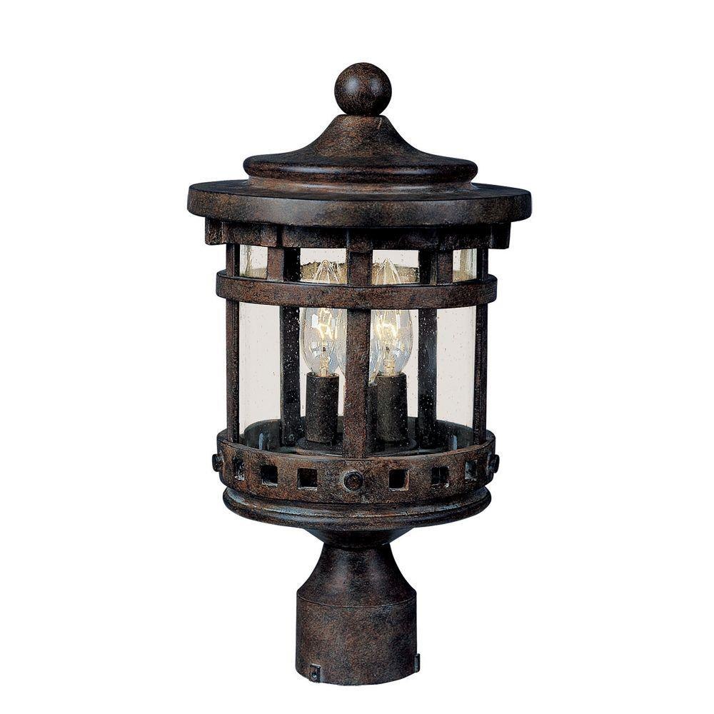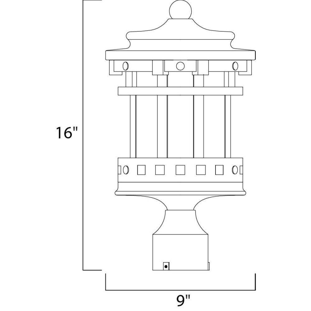 Very Rugged and durable outdoor post lantern...Maxim set out to make an extremely durable outdoor light and their engineers created a man-made material that is twice (2-times) as weather-resistant as conventional outdoor lantern material be it steel, resin or aluminum. The material is called Vivex and it will withstand temperatures up to 130-degrees or minus 20-degrees. And Maxim made the lantern even more durable by finishing it in a tough Sienna Bronze. Glass is Clear Seedy glass for a nice bright look. Generally classified as Round California Americana the outdoor post lantern is both very attractive to the eye and extremely weather durable. 16" overall height, 9" overall wide, fits standard 3” diameter outdoor post (post not included) and takes 3 x 60-watts candelabra for great brightness. 4". Wet Location Rated. Vivex is a unique new compound material specifically designed for use outdoors. It is composed of ground marble for strength and latex for durability. Vivex has been tested up to 130ºF and as low as -20ºF, so extreme weather conditions will no longer warp or damage your outdoor lighting fixtures. Vivex is flame retardant, non-corrosive, and UV resistant so it will not fade over time. Vivex is backed by a 3-year limited warranty by Maxim Lighting. Bold and beautiful, the Santa Barbara Collection lights the outdoors with assertive flair. Rich, saturated colors add to the distinctive masculine quality of this unmistakably mission-style fixture. A sturdy column of cool, seedy glass encases a solid pedestal showcasing candles that cast clear warm light through ample windows. Strong vertical lines connect with their horizontal counterparts to create the signature dentil pattern. The chocolaty sienna finish makes a statement all its own with an aesthetic range of hues from deep chestnut to copper highlights. As strong inside as it is out, Santa Barbara is made of Vivex, a material twice the strength of resin. Maxim—the smart choice for beautiful, durable outdoor lighting.