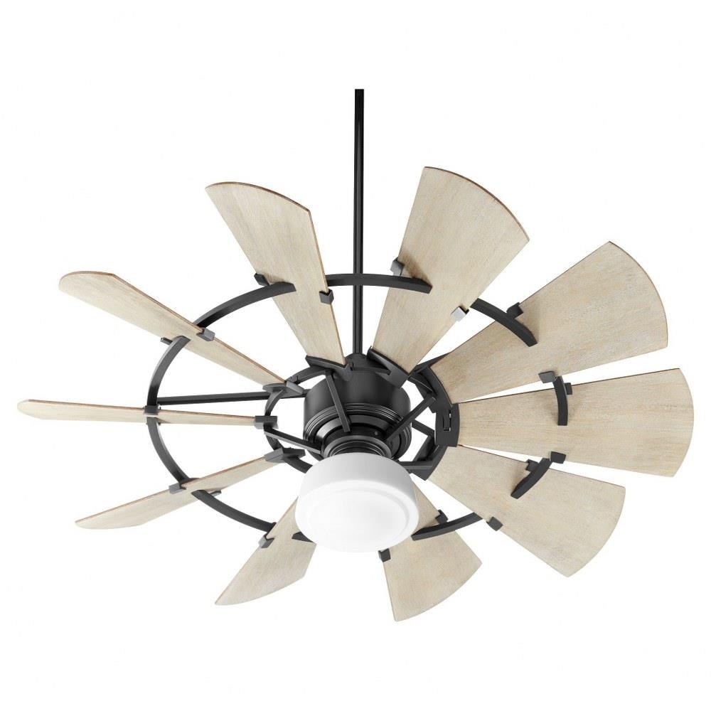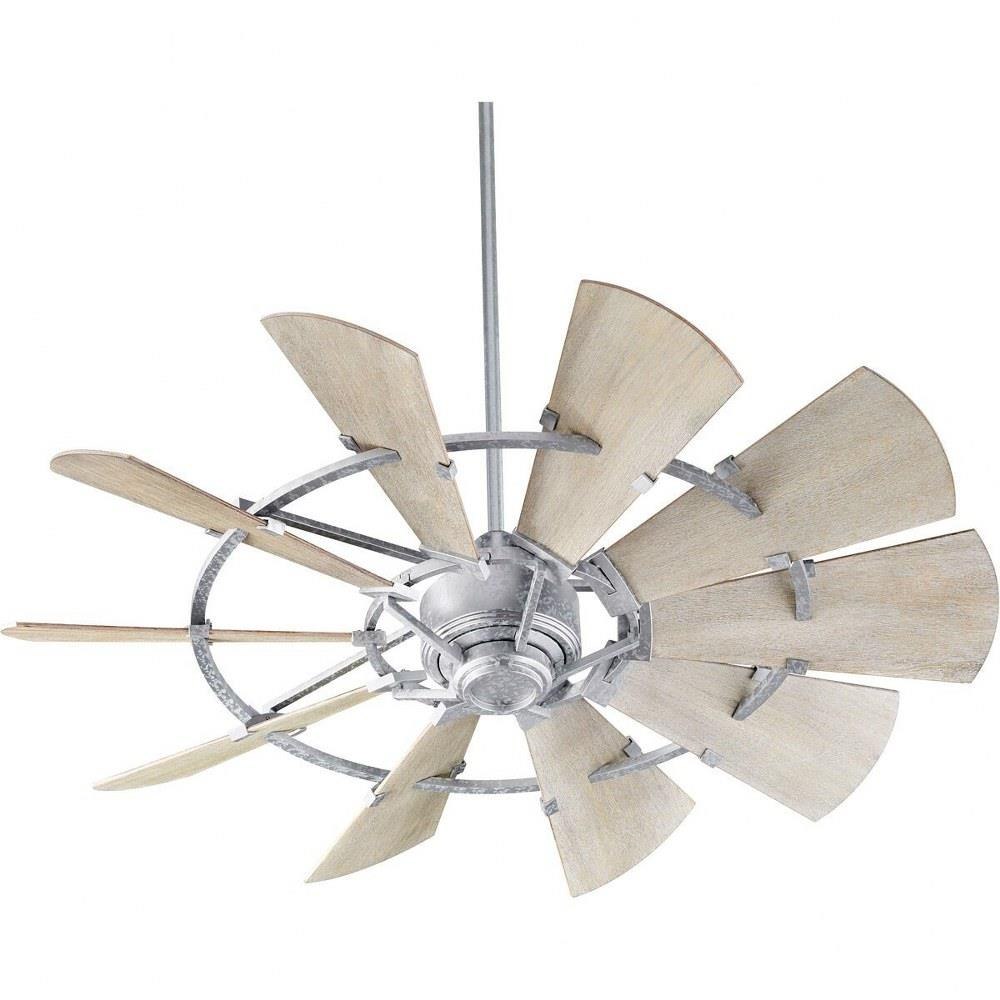 The Windmill fan is stem-hung and UL listed for indoor use. It is available in three finishes—Black, Oiled Bronze, and Galvanized—to suit various interior design schemes. While the fan does not include a light kit, multiple compatible light kit options (models 1902-86 through 1975-86) are available separately to customize lighting needs.